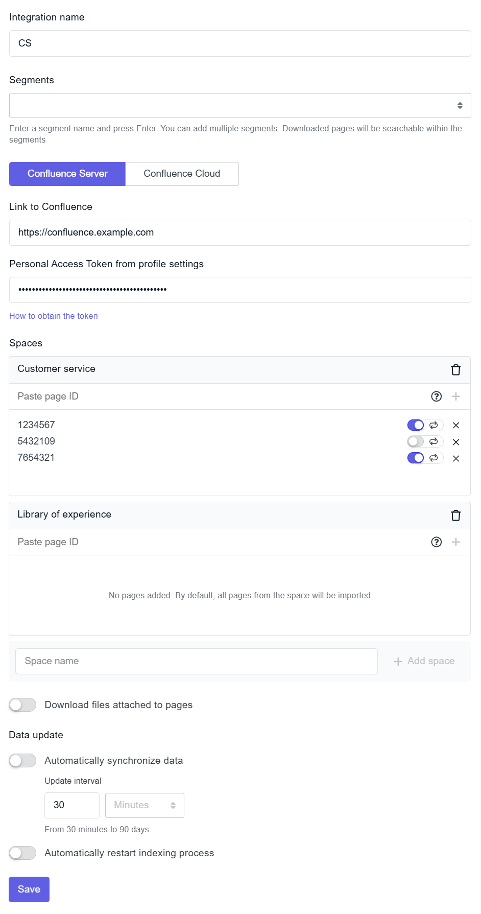 Integration enables importing data from Confluence into the knowledge base, automatically synchronising and re-indexing data.