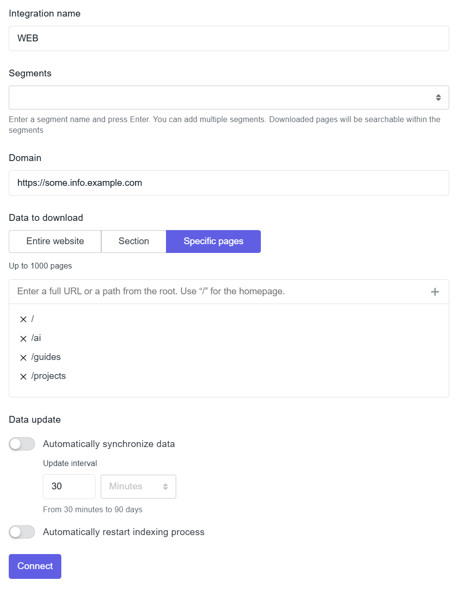 This integration enables you to import data from a website into your knowledge base. The data can be automatically synchronised and re-indexed.